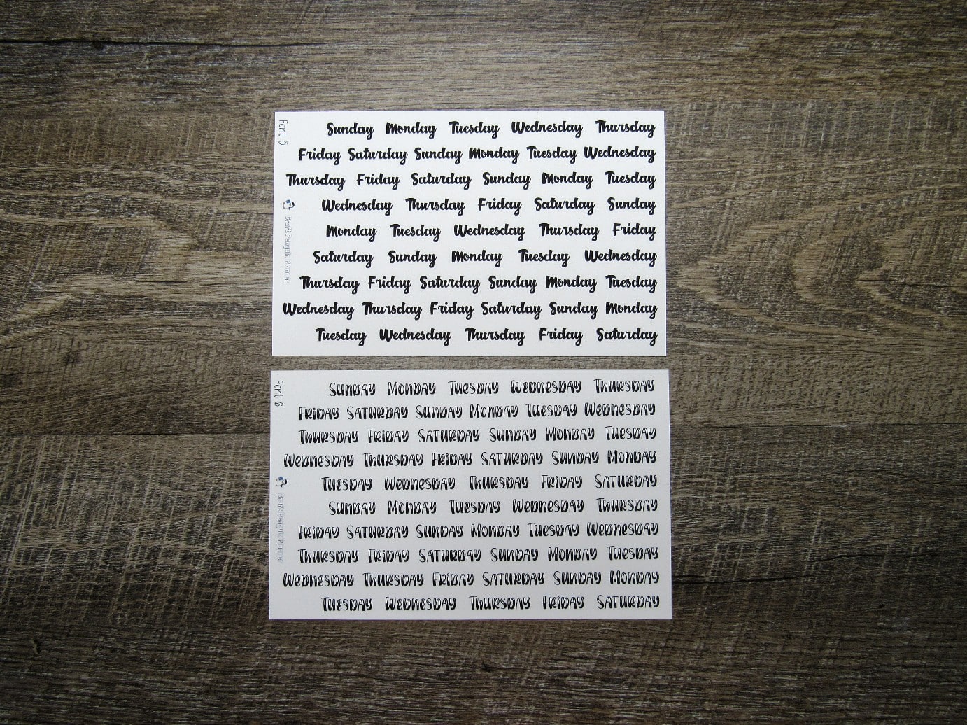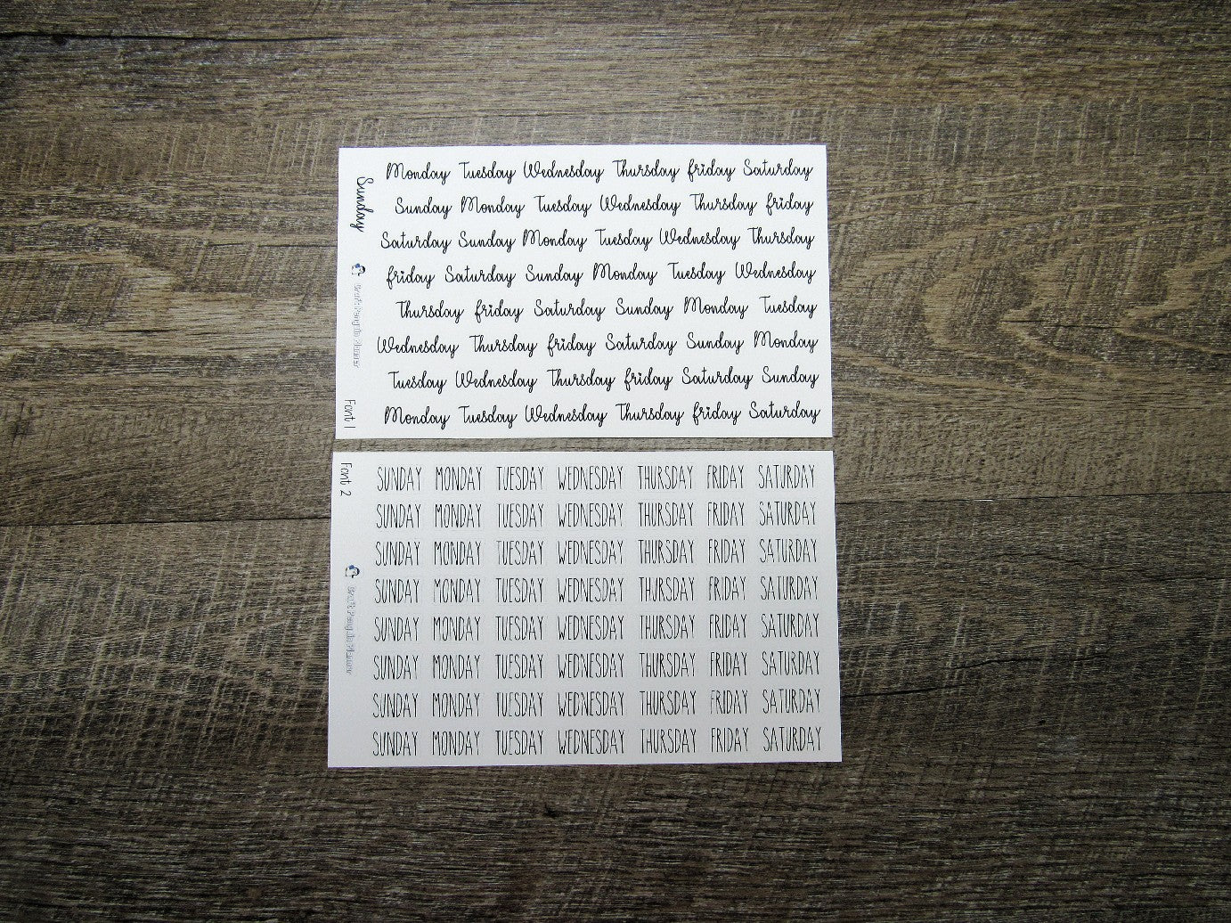 Script heights measure between 0.3"- 0.45". Length of stickers vary based on font, but measure no more than 1.4" wide.